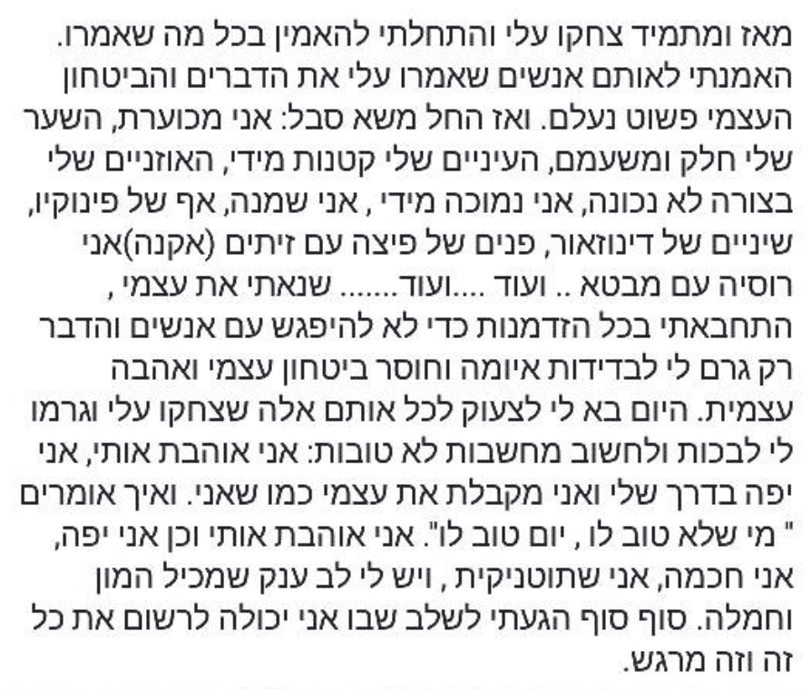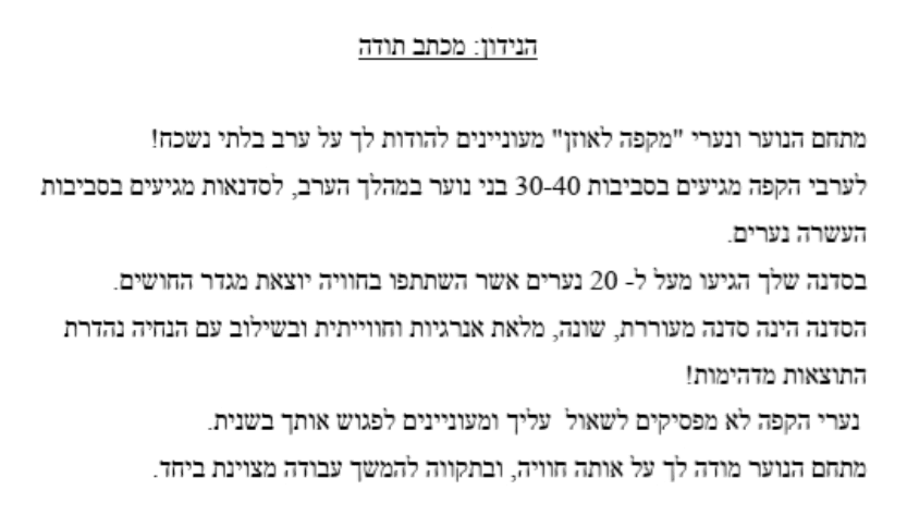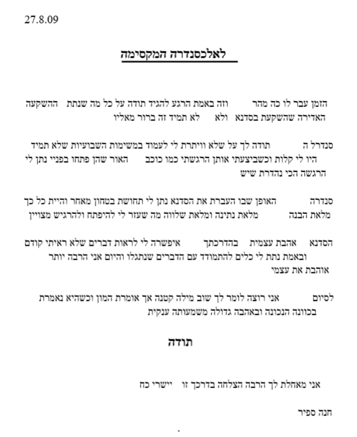 "אלכסנדרה אהובה, קודם כל אני רוצה להגיד לך תודה רבה! תודה שעזרת לי ולכולנו לראות את כל הטוב שבנו כמה אנחנו מדהימים יותר ממה שחשבנו! את אישה מדהימה ומה שאת עושה מדהים בעיני, כבר אמרתי לך שאת סוג של מודל לחיקוי, אין הרבה אנשים שעושים ואומרים וחיים בצורה שעושה להם טוב מבלי להסתכל לצדדים, ובעיניי זה דבר גדול! אף פעם לא אשכח אותך, את השיחות איתך, בשיעורים איתך למדתי ממך כל כך הרבה ובאמת תודה רבה לך!"