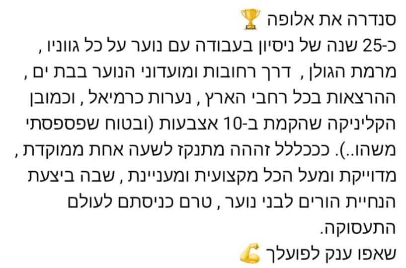 "תודה רבה אלכסנדרה על שיחה מעצימה שנתנה לי כוחות וחיזקה."