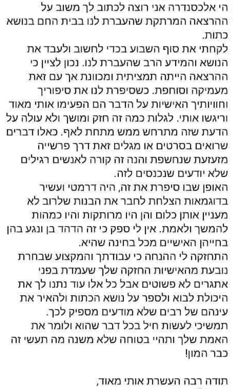 "תודה אלכסנדרה, על ההבנה, על הנתינה והקבלה, על היותך אוזן קשבת, על התובנות."