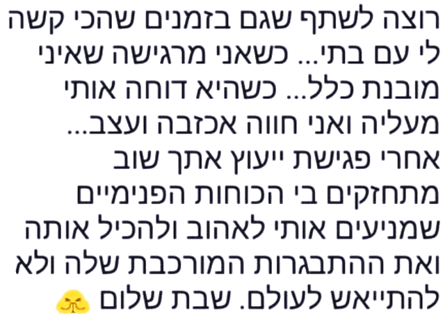 "רוצה לשתף שגם בזמנים שהכי קשה לי עם בתי.. כשאני מרגישה שאיני מובנת כלל... כשהיא דוחה אותי מעליה ואני חווה אכזבה ועצב... אחרי פגישת ייעוץ אתך שוב מתחזקים בי הכוחות הפנימיים שמניעים אותי לאהוב ולהכיל אותה ואת ההתבגרות המורכבת שלה ולא להתייאש לעולם. שבת שלום"